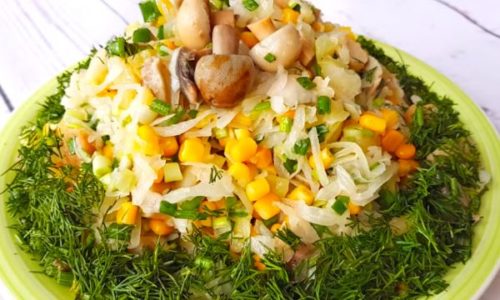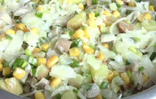 Досить ситне блюдо, мариновані гриби надають йому особливу пікантність.