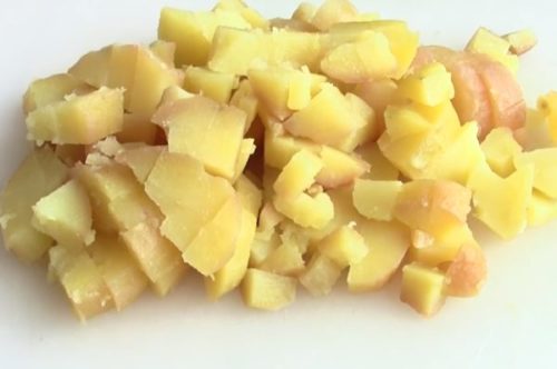 - Картоплю відварюємо в солоній воді, охолодити, очистити шкірку і нарізаємо кубиками.