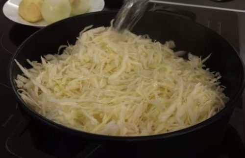 - Капусту дрібно шаткуємо і складаємо в каструлю, потім заливаємо її окропом. Залишаємо її на 1,5 години.