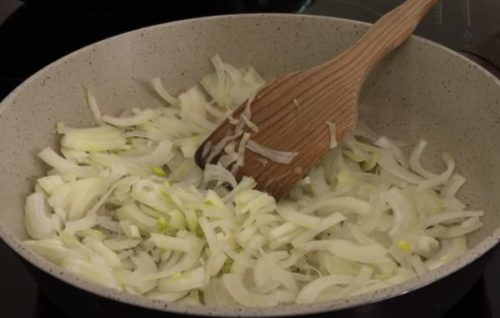 - В цей же час на сковороді тушкуємо цибулю, не треба чекати, щоб він придбав золотистий колір, головне, домогтися його м’якості.