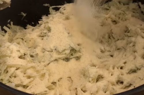 - Потім покладемо борошно, сіль, спеції і добре перемішати.