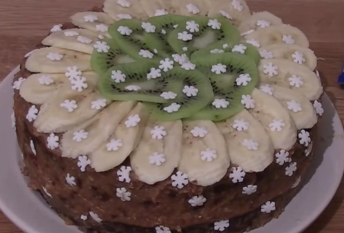 - Банани і ківі нарізаємо кружечками і викладаємо на поверхні, посипаємо сніжинками. Ними також обліпити боки десерту.