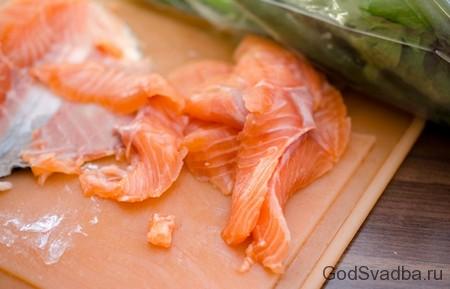 - Далі займаємося самим лососем. Рибку нарізаємо як вам подобається: або невеликими кубиками або брусочками, або ви можете купити лосось вже смужками і при готуванні бутерброда викласти з такої смужки красиву троянду.