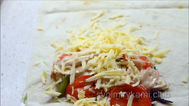 Крок 6. А тепер найцікавіше – збірка шаурми! Розстеліть лаваш по робочій поверхні, ближче до одного з країв викладіть спочатку капусту, зверху – курку, огірочки, часточки помідора, все це щедро полийте соусом і присипте сиром. Загорніть шаурму і відправте її в духовку, розігріту до 220°C, на 5 хвилин. Ось і все, ваша чудова шаурма готова!