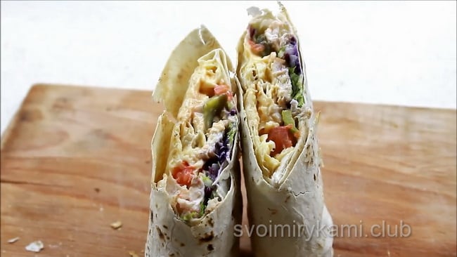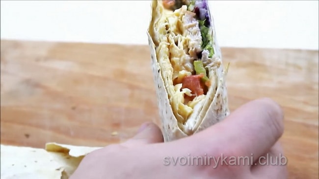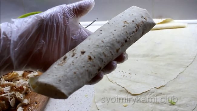 - Коли завертаєте шаурму, дотримуйтеся такої послідовності: спочатку коротка частина лавашу, потім – бокові, і тільки після цього згортайте в рулет по довгій частині.