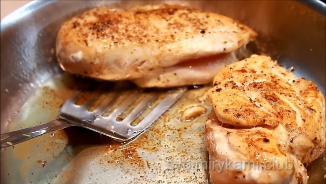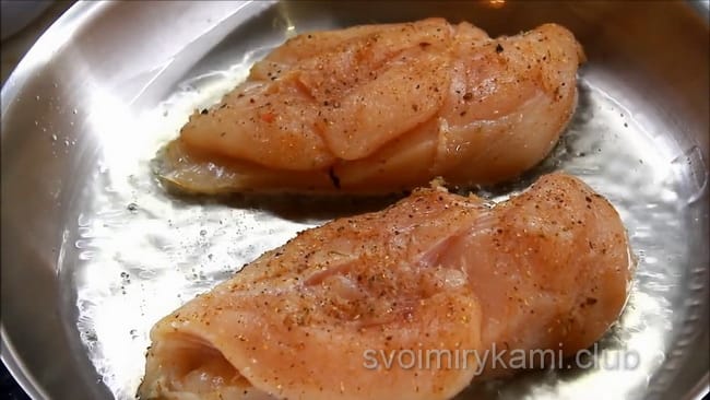 Крок 1. Куряче філе посолити, поперчити, приправити улюбленими спеціями і відправити на розпечену сковороду обсмажуватися з двох боків в рослинній олії на невеликому вогні.