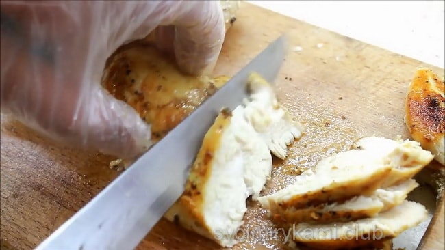 Крок 5. Готове куряче філе трохи остудіть і наріжте тонкими пластинками.