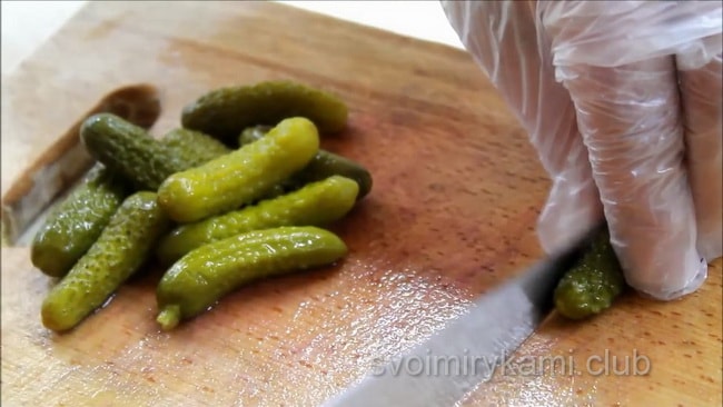 - Добре, якщо солоні огірочки будуть маленькими, типу корнішонів – так вам буде зручніше їх подрібнювати, так і стікати вони будуть набагато менше.