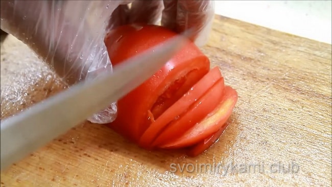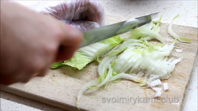 Крок 2. Поки курка смажиться, можна підготувати всі інші інгредієнти. Пекінську капусту потрібно нарізати дуже дрібною соломкою, солоні огірочки – так само, помідор – тоненькими півкільцями.