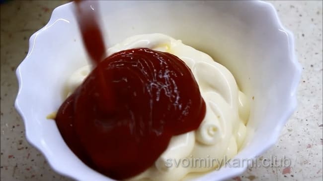 Крок 4. Для соусу в невеликій мисочці змішайте гірчицю, майонез і кетчуп і гарненько все це перемішайте.