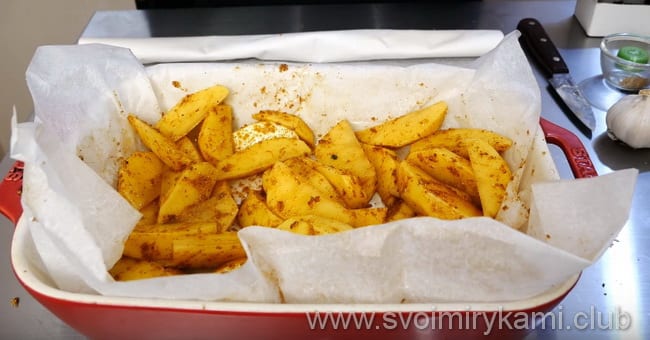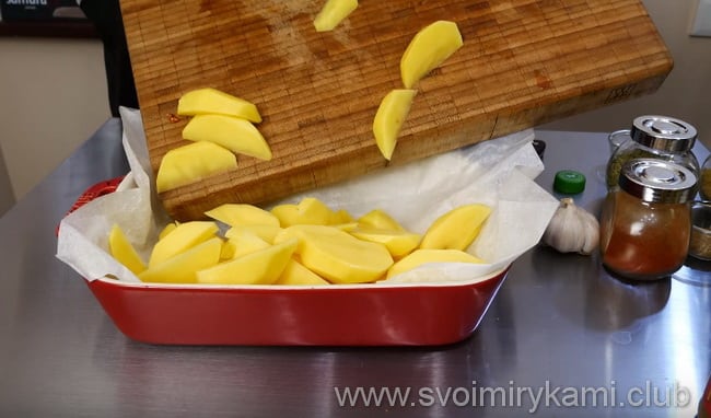 Чи знаєте ви? Картоплю потрібно готувати перед тим, як поставити його в духовку, щоб він не потемнів. Його ми будемо запікати окремо від курки, бо картопля готується швидше і може підгоріти.
