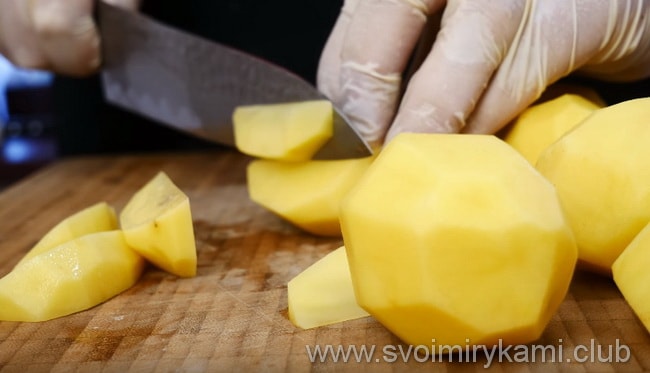 Помийте картоплю, очистіть його від шкірки і наріжте на шматочки.