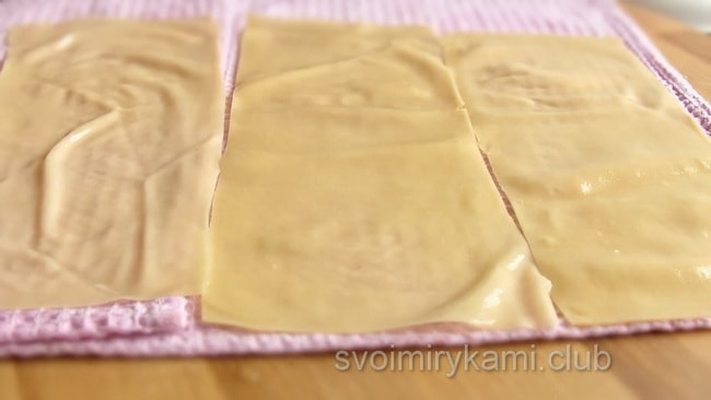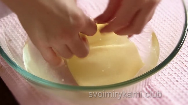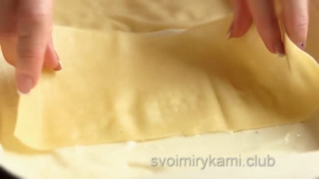 Відваріть листи лазаньї в солоній воді близько 4 хвилин. Потім викладіть 3 листа на дно форми для випікання. Кількість аркушів і начинки визначайте за розмірами вашої форми.