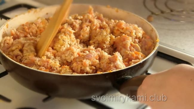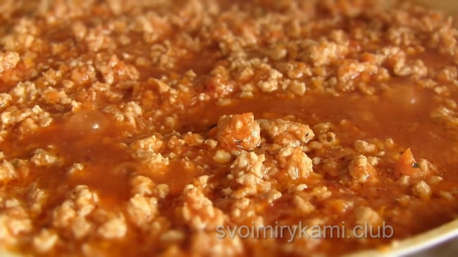 Обсмажте очищений і нарізаний лук. Коли він стане м’яким, додайте фарш і продовжуйте обсмажувати 10 хвилин. М’ясний бульйон змішати з томатною пастою і залийте цією сумішшю фарш. Посоліть і поперчіть, накрийте кришкою і тушкуйте ще 10 хвилин.