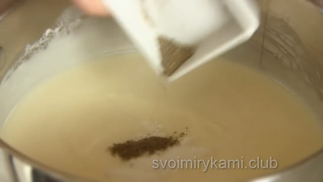 У сотейнику розтопіть вершкове масло, додайте туди просіяне борошно і перемішайте віночком. Поступово вливайте вершки тонкою цівкою. Вершків може знадобитися трохи менше, ніж зазначено в рецепті. Коли соус почне густіти, посоліть, додайте мускатний горіх і доведіть до кипіння. При цьому постійно помішуйте. Як тільки соус закипить, вимкнути плиту.