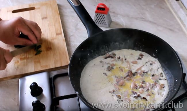 • Свіжий базилік дрібно ріжемо, висипаємо в сковороду і готуємо 3 хвилини.