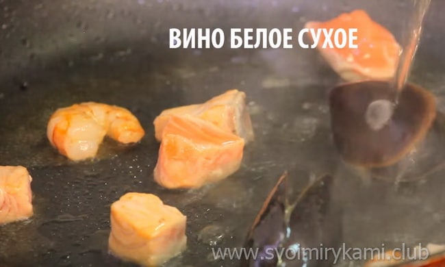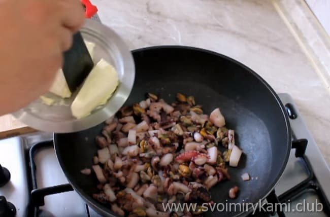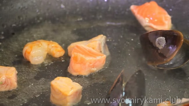 • Обсмажуємо морепродукти на оливковій олії 9 хвилин.