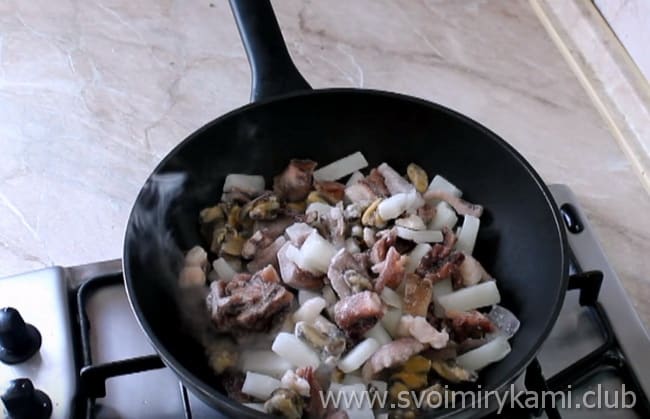 • Цибулю і часник ріжемо і обсмажуємо на суміші масел.