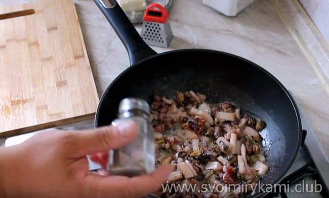 • Викладаємо на сковороду, присипаємо пармезаном і перемішуємо.