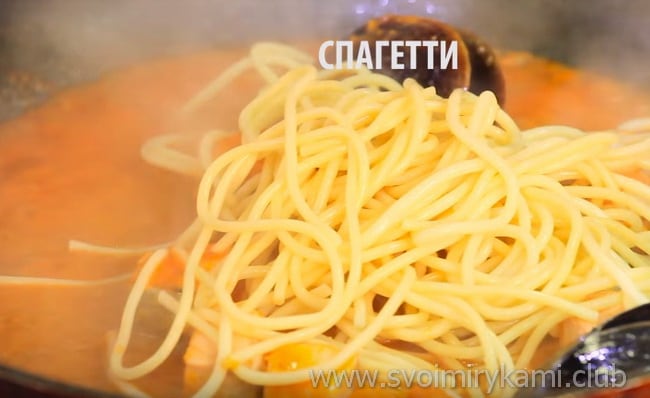 • Спагетті викладаємо до морепродуктів.