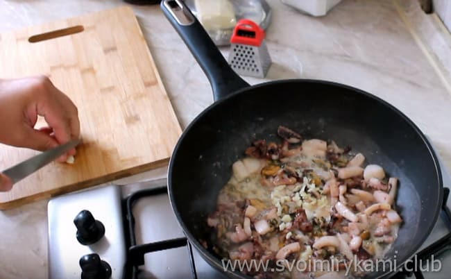 • Дрібно ріжемо часник і висипаємо до морепродуктів.