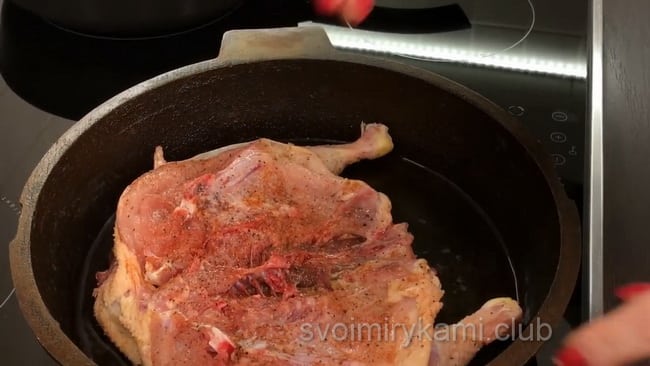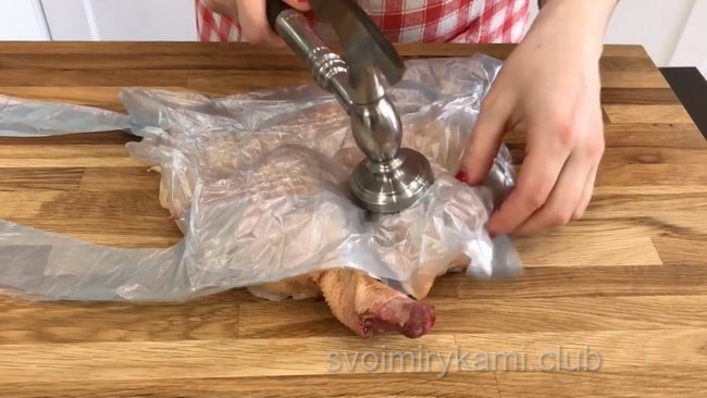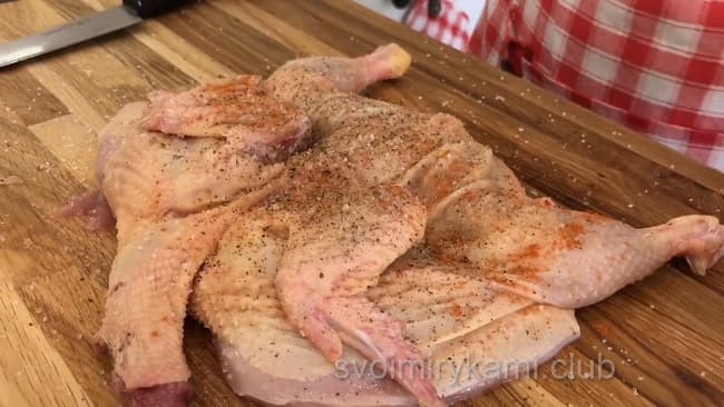 Візьміть курчати, випатрайте з нього нутрощі і добре промийте. Потім відбийте молотком, щоб переламати кісточки і зробити майже плоским. Посоліть і поперчіть з двох сторін, втираючи спеції в м’ясо.