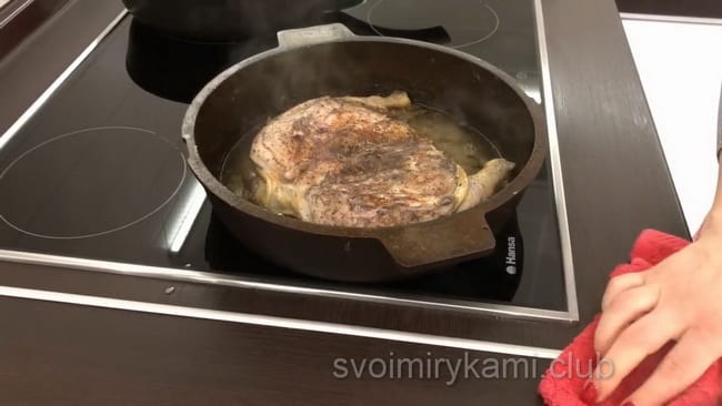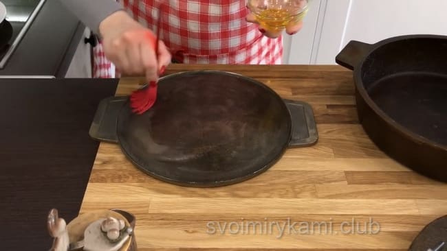 Візьміть 2-3 столові ложки топленого масла, добре змастіть всю поверхню сковороди і почекайте, поки воно все розтане. Покладіть в нього курчати крильцями вниз. Накрийте плоскою кришкою і поставте зверху прес. Поставте сковорідку з пресом в розігріту духовку до максимуму (240-250°). І залиште на 10-12 хвилин.