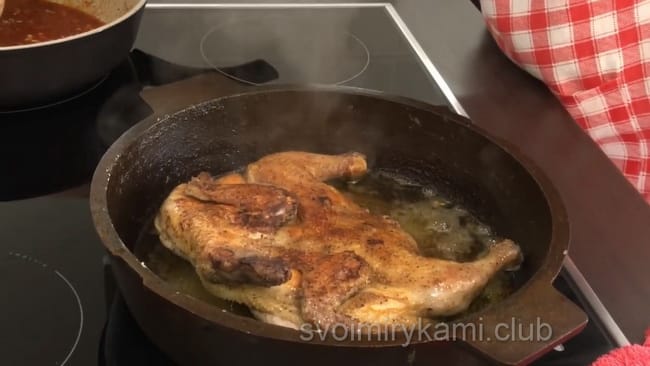 Відкрийте кришку сковороди з курчам, перевірте його готовність з одного боку і переверніть на іншу. Злегка змастіть приготованим соусом підсмажений бік і знову накрийте курчати кришкою з пресом. Через 10-12 хвилин можна подавати страву до столу, не забувши про соус.