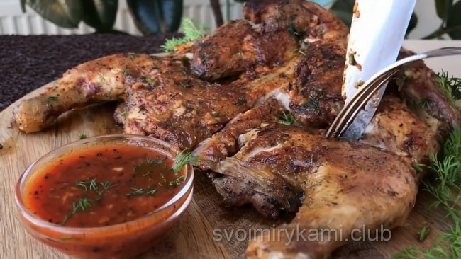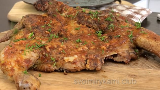 - Замінити курчати можна куркою, розрізаної навпіл. В такому разі її потрібно буде довше смажити.
