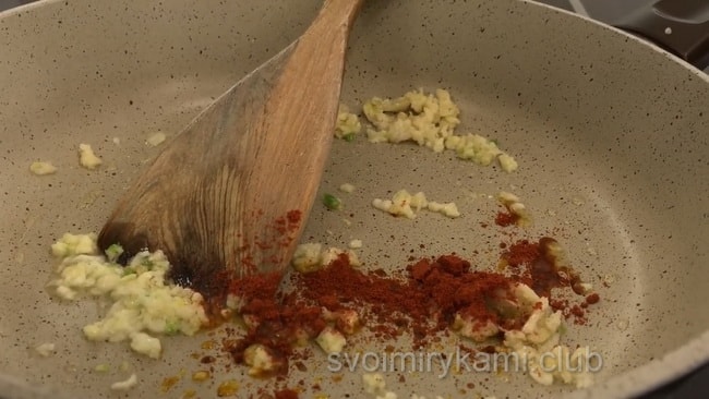На розігріту сковороду покладіть подрібнений часник і смажте 1-2 хвилини. Потім додайте спеції і перемішайте. Влийте в сковороду сік і тушкуйте ще 2-3 хвилини.