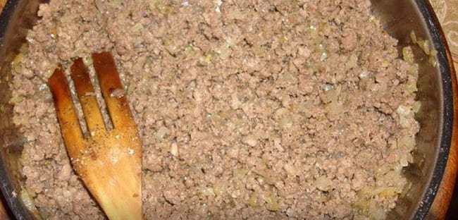 Додайте фарш в сковороду з цибулею і обсмажте до готовності. Потім цю начинку потрібно обов’язково остудити.
