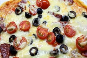 Щоб верх піци був особливо соковитим, перед випічкою спробуйте скропити його оливковою олією. Також це не дасть начинці потемніти.