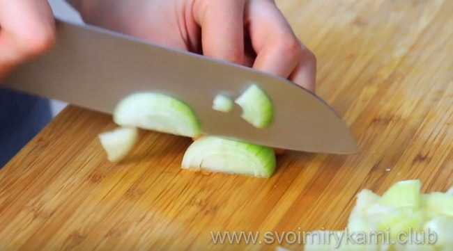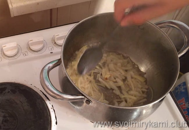 • Тепер готуємо соус. У гарячу і змащену маслом сковороду засипаємо залишився нарізану цибулю і трохи обсмажуємо