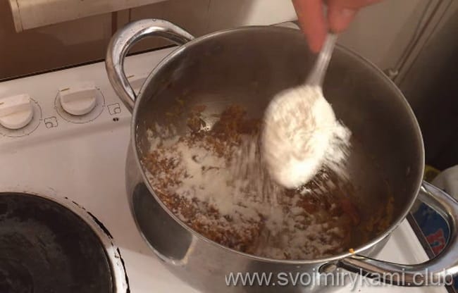 Продовжуючи активно помішувати, додаємо воду або бульйон, потім сметану і томатну пасту, приправляємо за смаком і доводимо до кипіння.