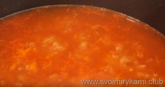 Попередньо обсмажені тюфтельки викладемо в глибокий казан, заллємо соусом і будемо гасити на повільному вогні близько 50 хвилин.