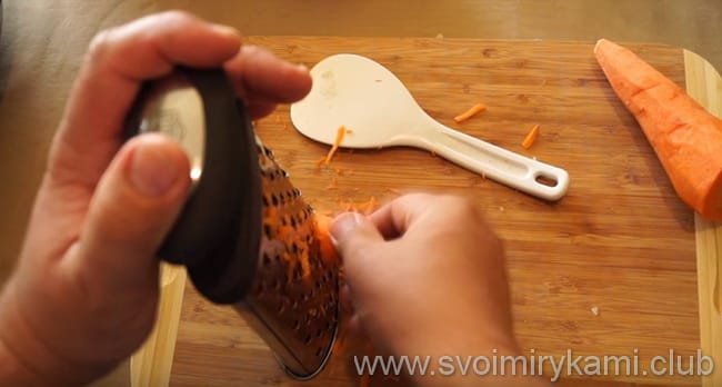 • Поки готується рис, займемося овочами. Очистимо цибулю і моркву, промиємо, цибулю наріжемо дрібними кубиками