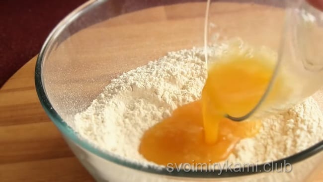 У миску просіяти борошно і зробити невелике поглиблення посередині. Яйця збовтати, додати сіль і вилити в поглиблення в муці. Додати оливкове масло і трохи води, не більше 2 ст. ложок.