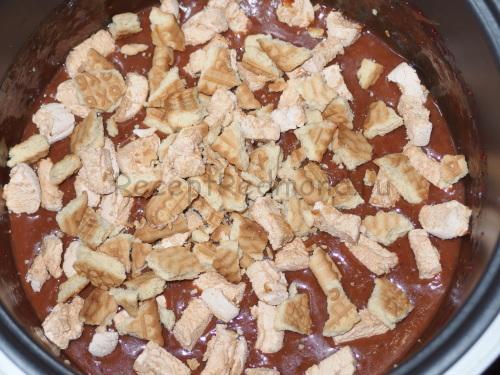Додайте в гарячу масу печиво і зефір. Тут є ще один нюанс — зефір при високій температурі почне плавиться і залишати в кремі білі розводи. А якщо його покласти в холодне, то він збереже ту ж форму.Намажте ваш чудові крем на печиво, тост або булочку. Я думаю, ласуни отримають справжнє задоволення від цього крему.
