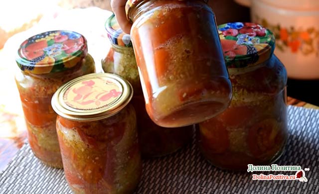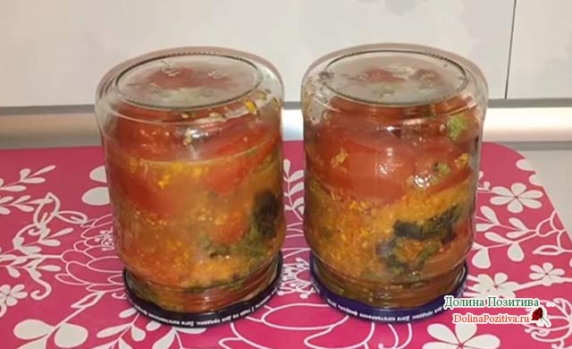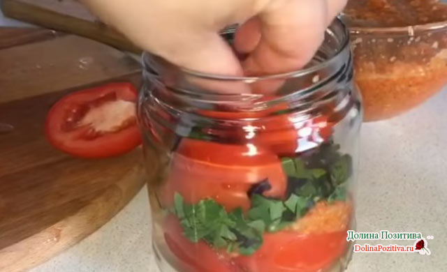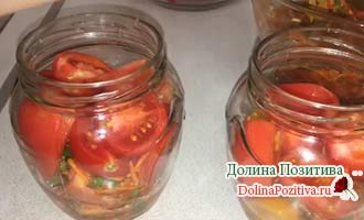 Банки попередньо стерилізуємо. Потім наповнюємо ємності томатами і приправою – чергуємо шарами. Закриваємо кришками.