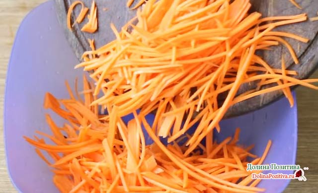 Шаткуємо очищену моркву соломкою. Рекомендується скористатися спеціальною терткою для страв по-корейськи.