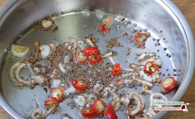 - Коли ріпчасті часточки обсмажиться, додаємо насіння, гіркий перець. Обсмажуємо близько хвилини.