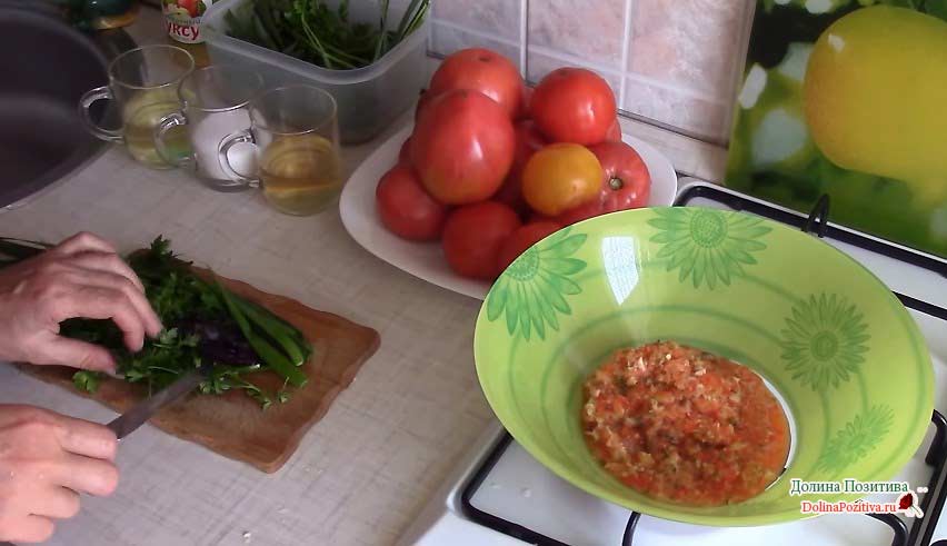 2. Дрібно шаткуємо зелень, змішуємо з гострою масою.