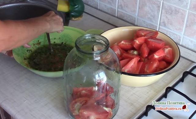 5. Викладаємо плоди шарами в банку, чергуючи з заливкою. Намагаємося все залишки заправки ввести зверху, щоб приправа стікала по помидоркам.