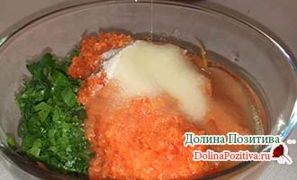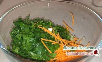 Нарізаємо цибулю шаткуємо зелень і з’єднуємо з морквою і перекрученими овочами. Вводимо сіль, масло, цукровий пісок, оцет, перемішуємо.