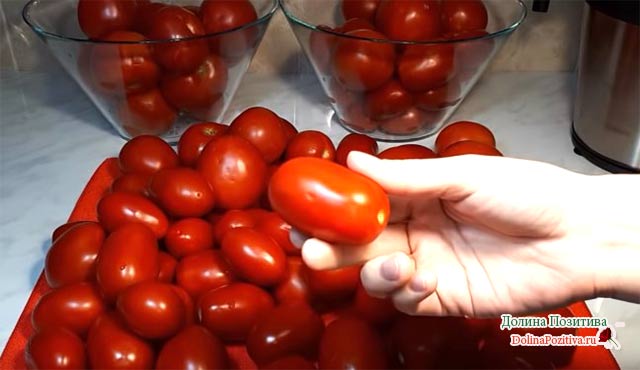 Томати в томатному соку виходять неймовірно смачними. Для приготування зимової заготівлі нам знадобиться два види томатів. Великі плоди підійдуть для приготування томатного соку, яким ми будемо заливати дрібні овочі для закладки в склотару.