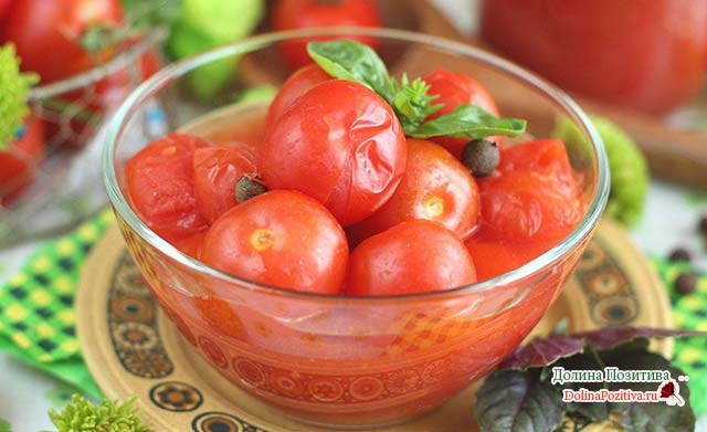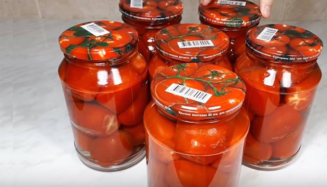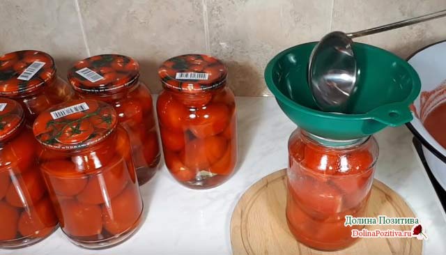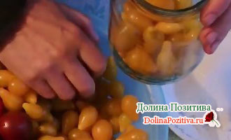 У томатів, призначених для укладання в ємність, відрізаємо частина плоду (місце кріплення чашолистка). Помідори щільно утрамбовується в банки, заливаємо крутим окропом. Накриваємо чистими металевими кришками для заготовок, закутуємо теплим рушником. Наповнені банки прогріваємо чверть години.