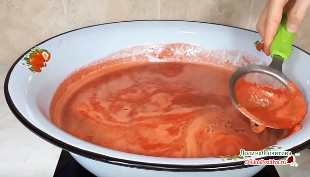 - Беремо 1,7 літра томатної пасти і стільки ж води, 3 чайної ложки цукру, 3 їдальні солі, 20 горошин чорного перцю, 2 листочка лаврушки. Всі інгредієнти відправляємо в каструлю і кип’ятимо.