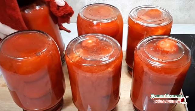 Підготовлені помідори заливаємо соусом, закатуємо кришками. Остуджуємо заготовки в перевернутому стані під теплим пледом.