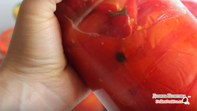 Під час стерилізації овочеві шматочки просідають. В склотарі утворюється вільне місце. Господині не радять доповнювати банку свіжими овочевими шматочками. Краще брати пропарені томати з сусідньої банки.