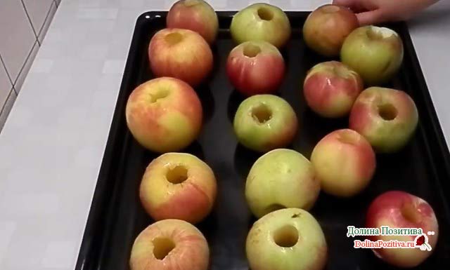 Вирізаємо у яблук серцевини за допомогою спеціального ножа. Плоди залишилися цілими. Відправляємо фрукти в духовку, розігріту до 200 градусів. Випікаємо їх до стану м’якості.
